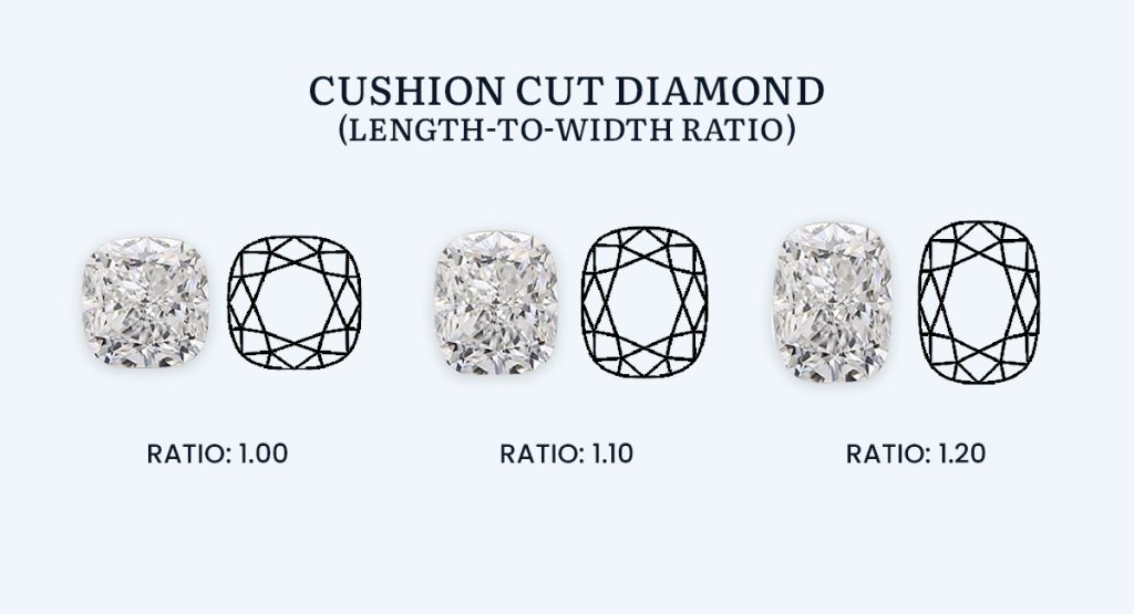 The ultimate beauty of the cushion-cut diamond lies in the accurate proportions and cuts. Considering a higher ratio like 1.3 will provide a stretched rectangular and flattering shape.